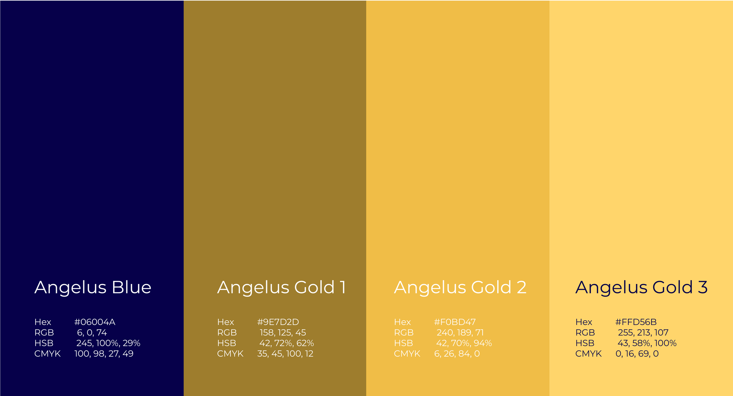 Centered on Deep Navy (Angelus Blue, Hex #06004A) for trust and calm, complemented by a gradient of Gold Foil Accents: Angelus Gold 1 (#9E7D2D), Gold 2 (#F0BD47), and Gold 3 (#FFD56B) for warmth and luminosity. Parchment Cream adds a soft, organic neutrality for backgrounds and text, enhancing readability and approachability.